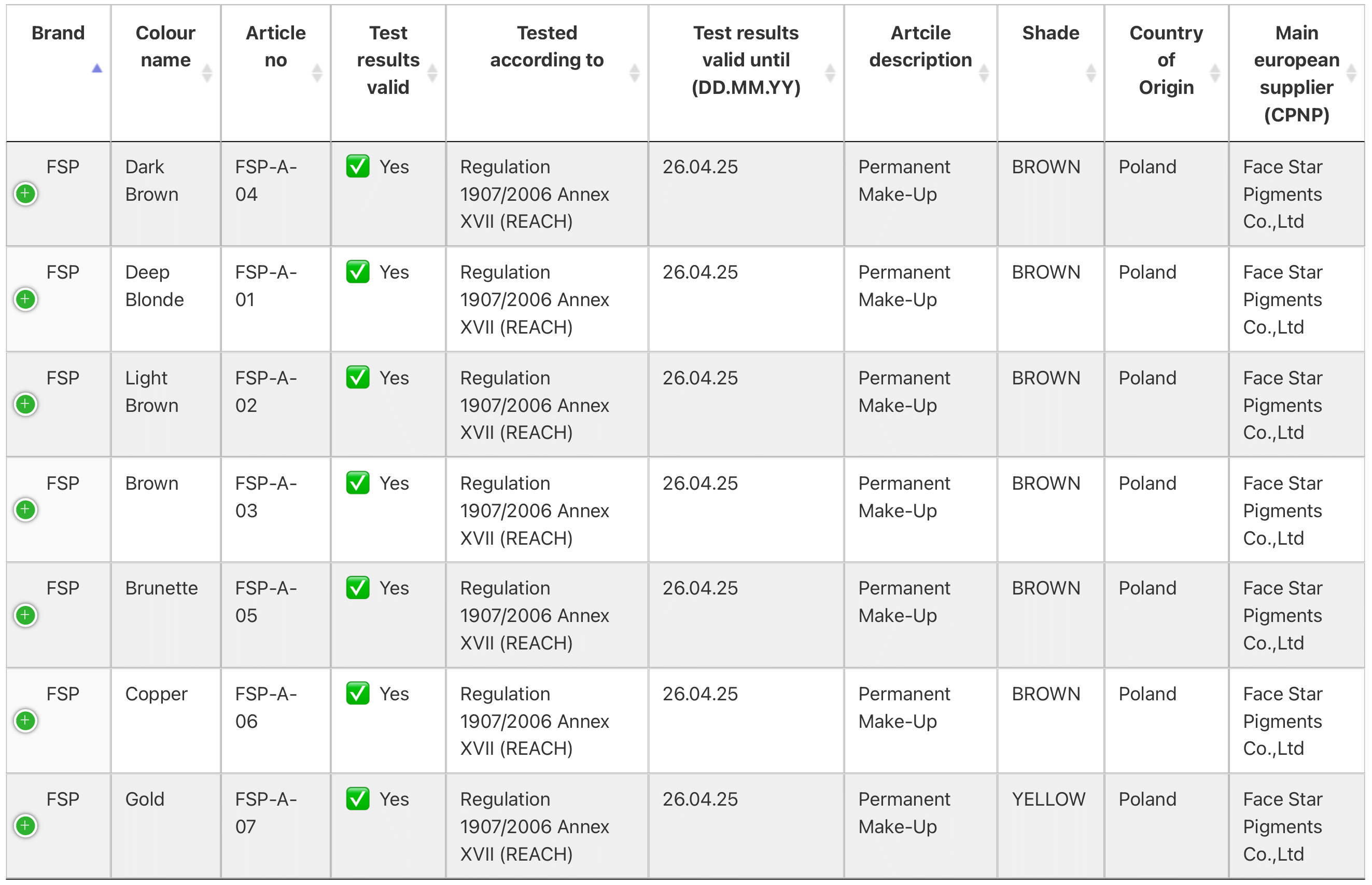 The table provides information on the brand, colour name, article no., test results, tested according to, test results valid until, article description, shade, country of origin, and main European supplier. This table is an invaluable resource for anyone looking to make sure their tattoo and permanent make-up products are safe.